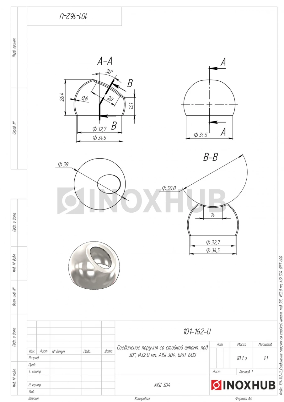 Соединение поручня со стойкой штамп. под 30°, Ø32.0 мм, AISI 304, GRIT 600