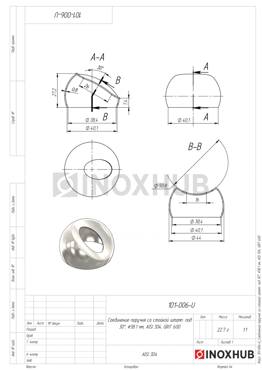 Соединение поручня со стойкой штамп. под 30°, Ø38.1 мм, AISI 304, GRIT 600
