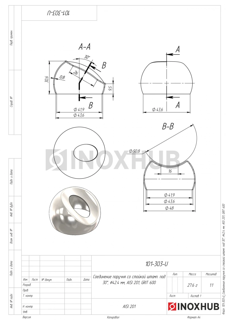 Соединение поручня со стойкой штамп. под 30°, Ø42.4 мм, AISI 201, GRIT 600