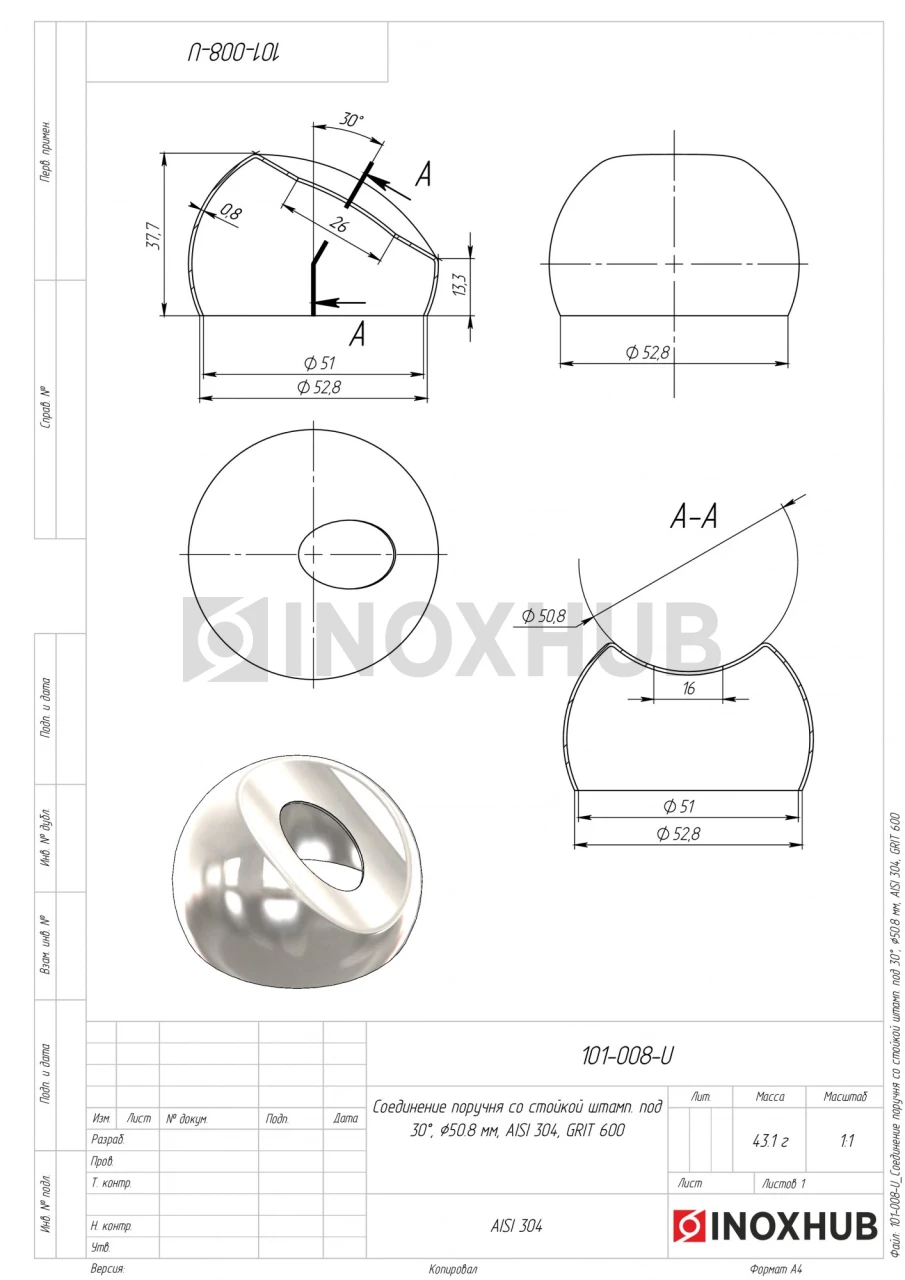 Соединение поручня со стойкой штамп. под 30°, Ø50.8 мм, AISI 304, GRIT 600