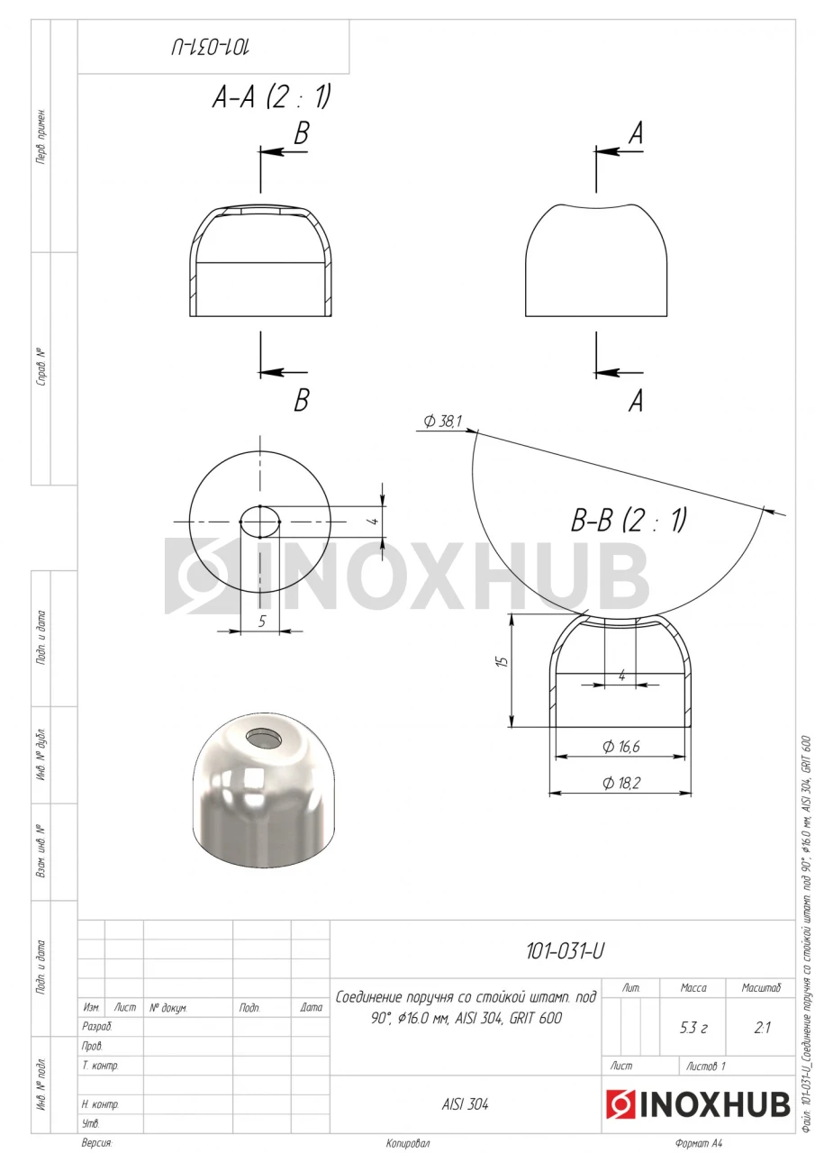 Соединение поручня со стойкой штамп. под 90°, Ø16.0 мм, AISI 304, GRIT 600