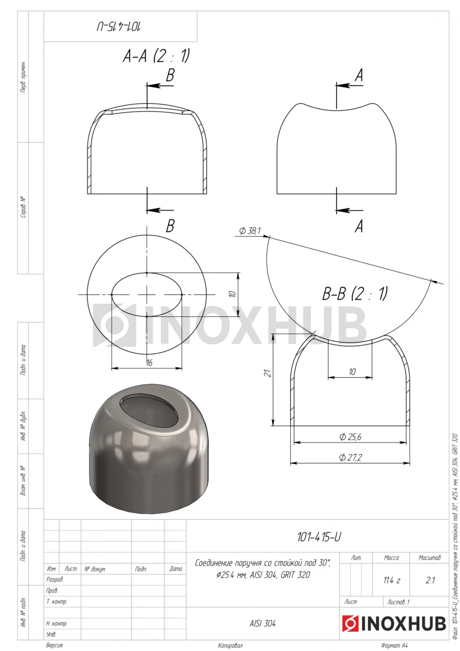 Соединение поручня со стойкой штамп. под 90°, Ø25.4 мм, AISI 304, GRIT 320