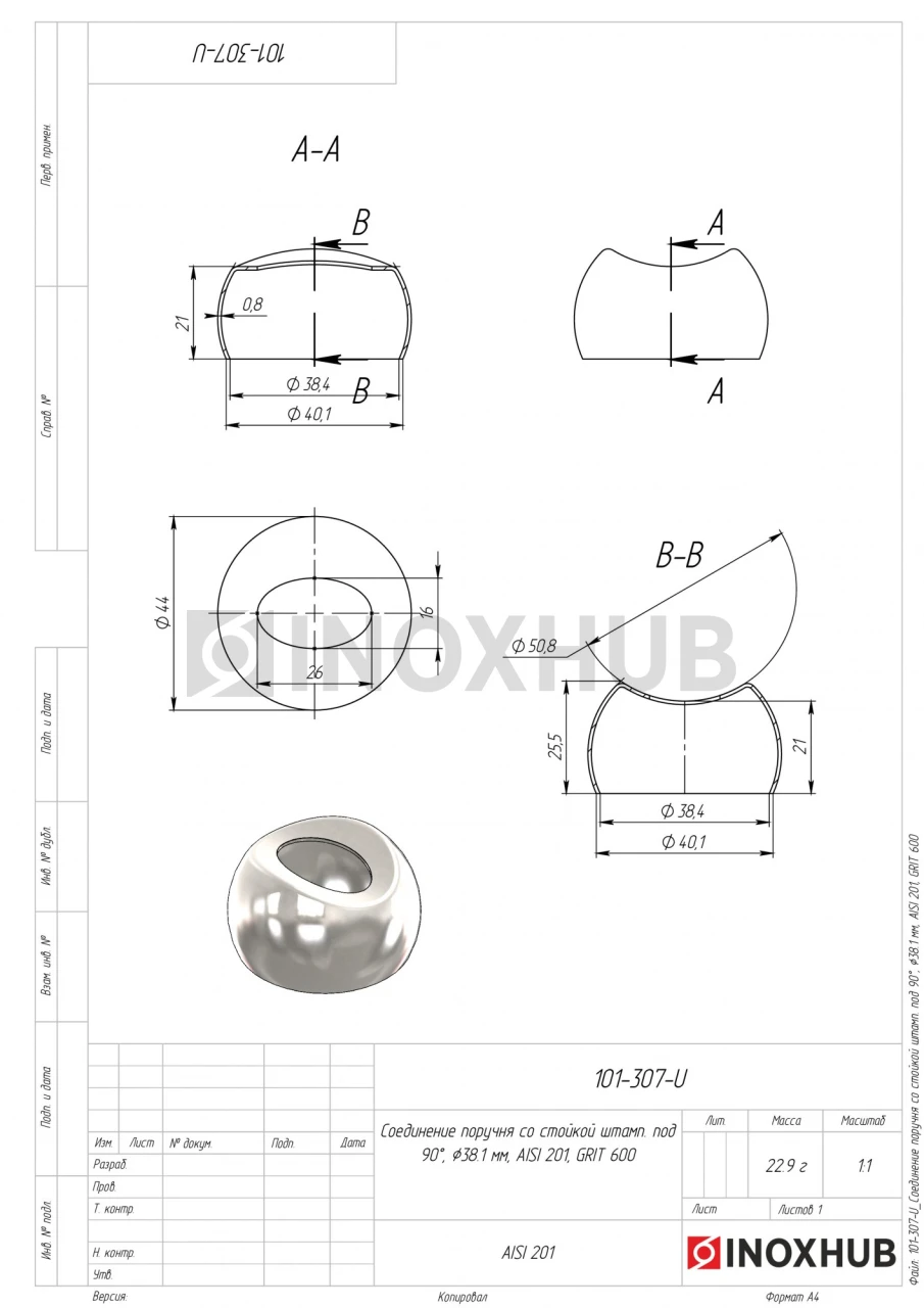 Штампованное соединение поручня со стойкой под прямым углом и диаметр 38,1 мм. Выполнено из стали AISI 201. Поверхность GRIT 600 — полированная.
