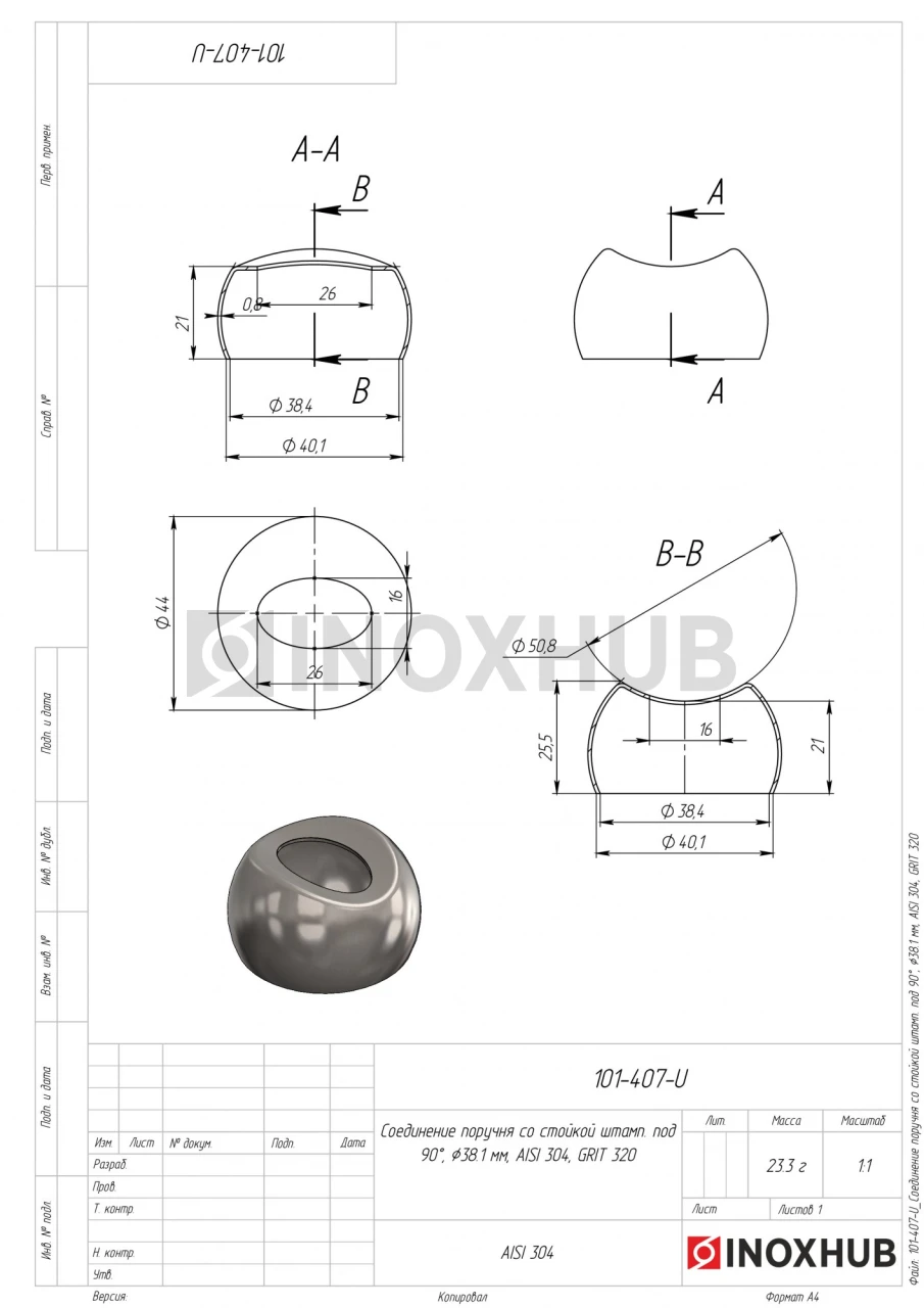 Соединение поручня со стойкой штамп. под 90°. Выполнено из стали AISI 304. Поверхность изделия GRIT 320, шлифованная. Ложемент предназначен под круглый поручень. Размер стойки составляет 38,1 мм, а размер поручня — 50,8 мм.