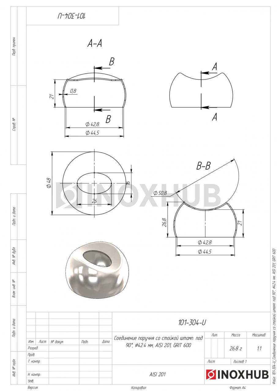 Соединение поручня со стойкой штамп. под 90°, Ø42.4 мм, AISI 201, GRIT 600