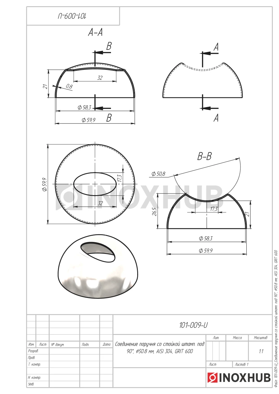 Соединение поручня со стойкой штамп. под 90°, Ø50.8 мм, AISI 304, GRIT 600