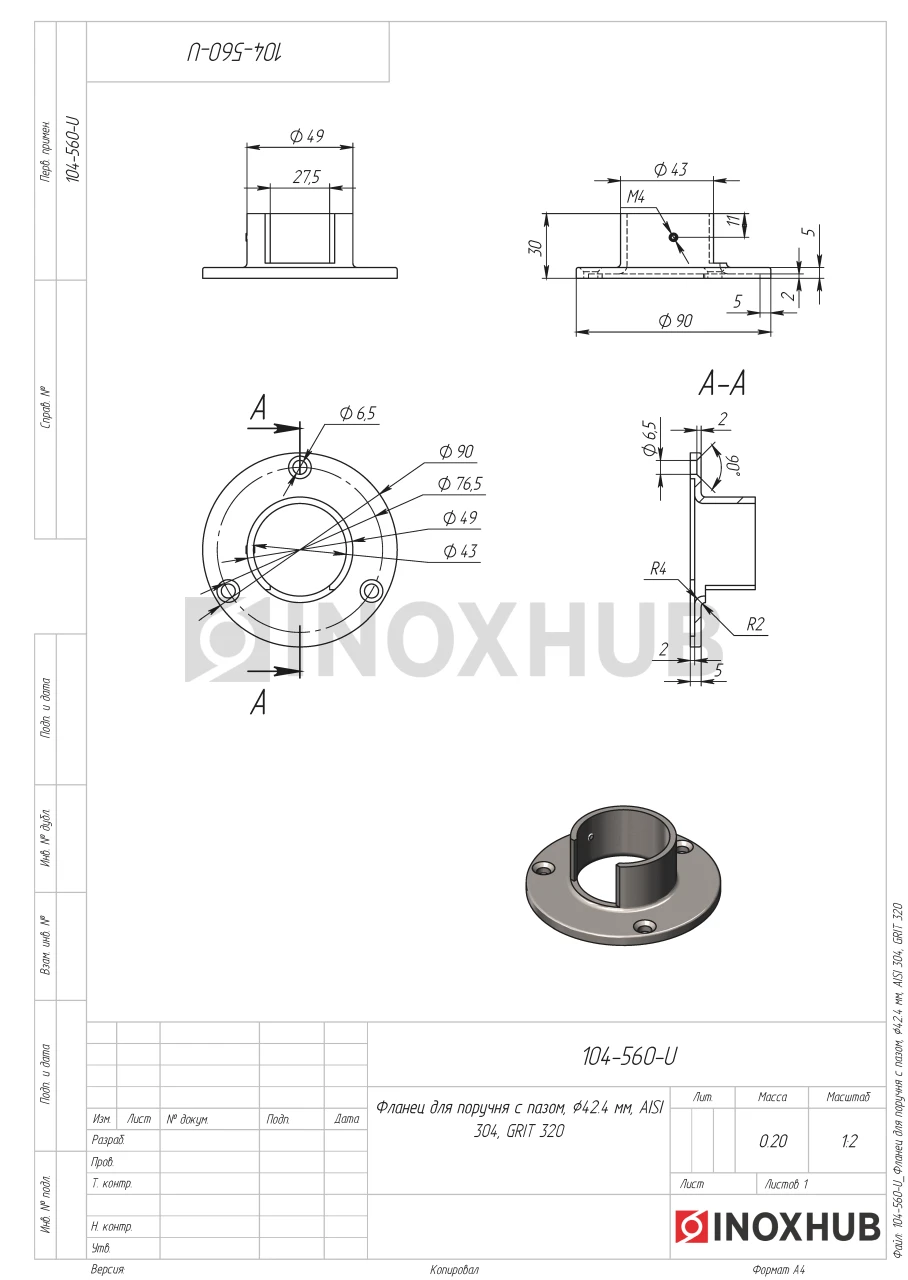 Фланец для поручня с пазом, Ø42.4 мм, AISI 304, GRIT 320