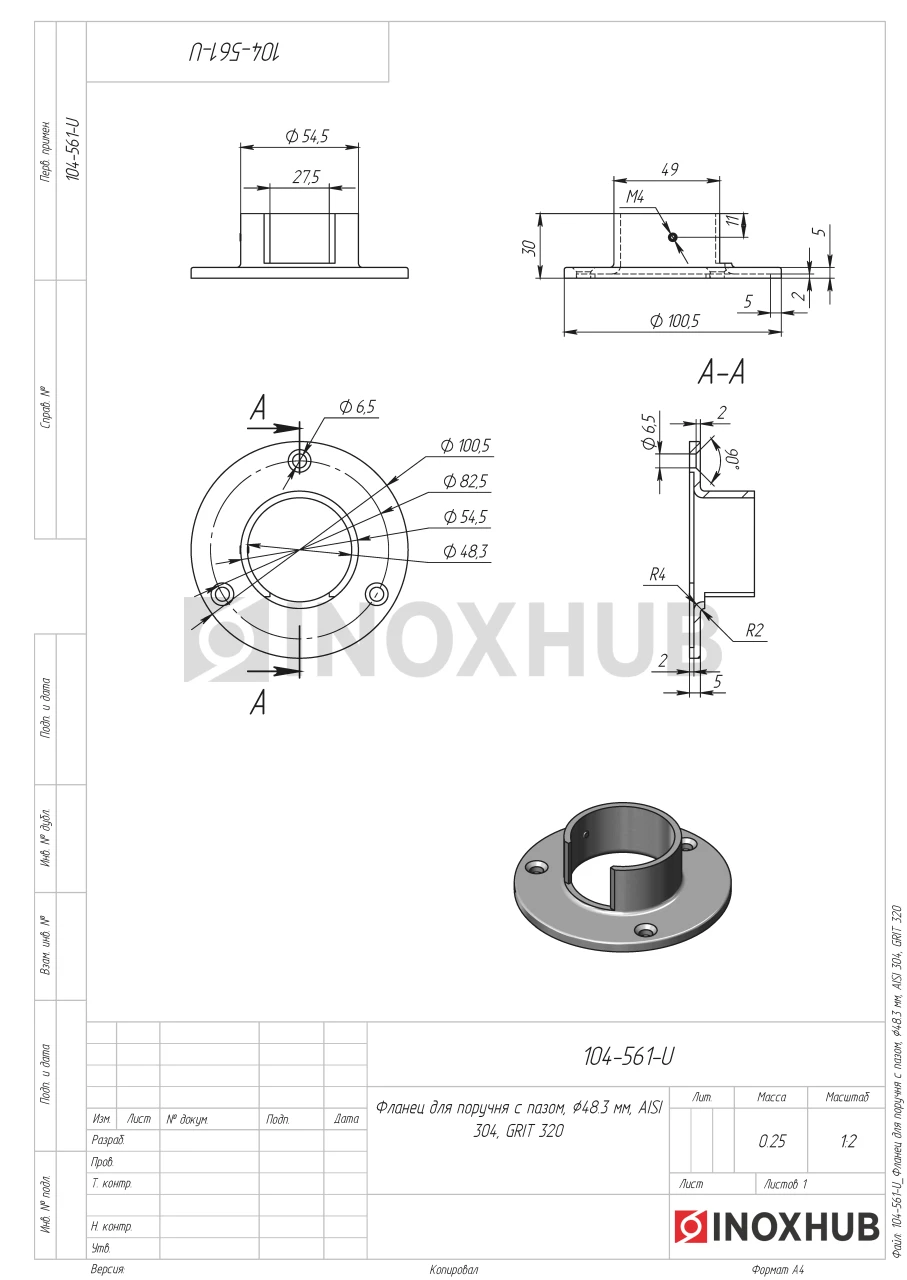 Фланец для поручня с пазом, Ø48.3 мм, AISI 304, GRIT 320
