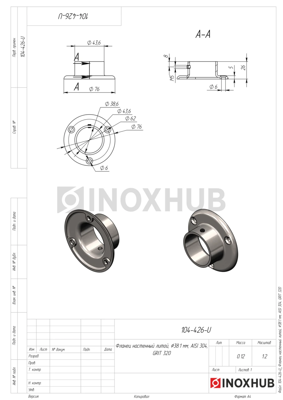 Фланец настенный литой, Ø38.1 мм, AISI 304, GRIT 320