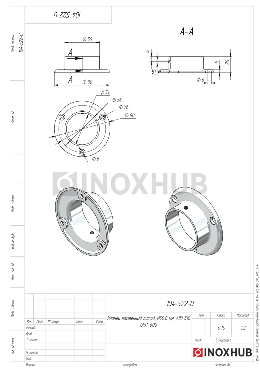 Фланец настенный литой, Ø50.8 мм, AISI 316, GRIT 600