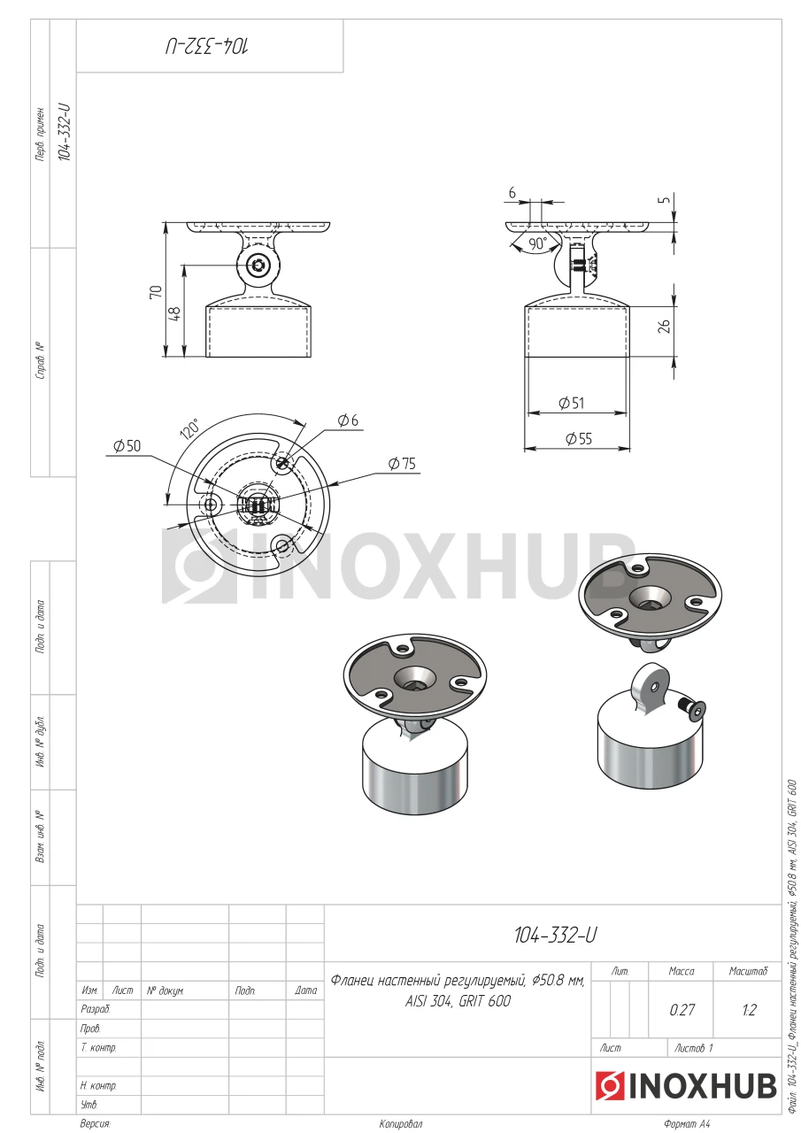 Фланец настенный регулируемый, Ø50.8 мм, AISI 304, GRIT 600