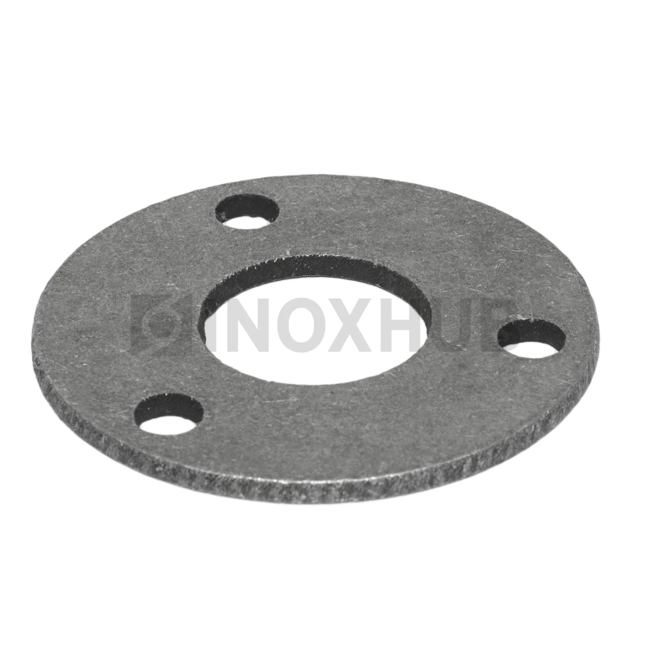 Фланец служит основанием для крепления стоек диаметром 38,1 мм. Сталь 3 — более дешевый аналог AISI 304, однако устойчива к коррозии, хорошо переносит динамические нагрузки. Фланец не рекомендуется использовать в условиях агрессивной среды, при низких температурах. Поверхность не обработана, поэтому требуются декоративные накладки.