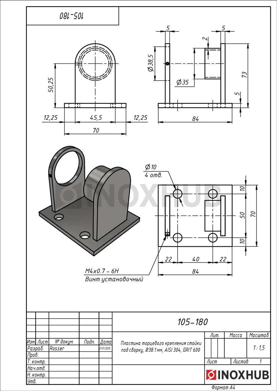Пластина для торцевой установки стойки под сборку. Выполнена из стали AISI 304, имеет поверхность GRIT 600 (полированную).