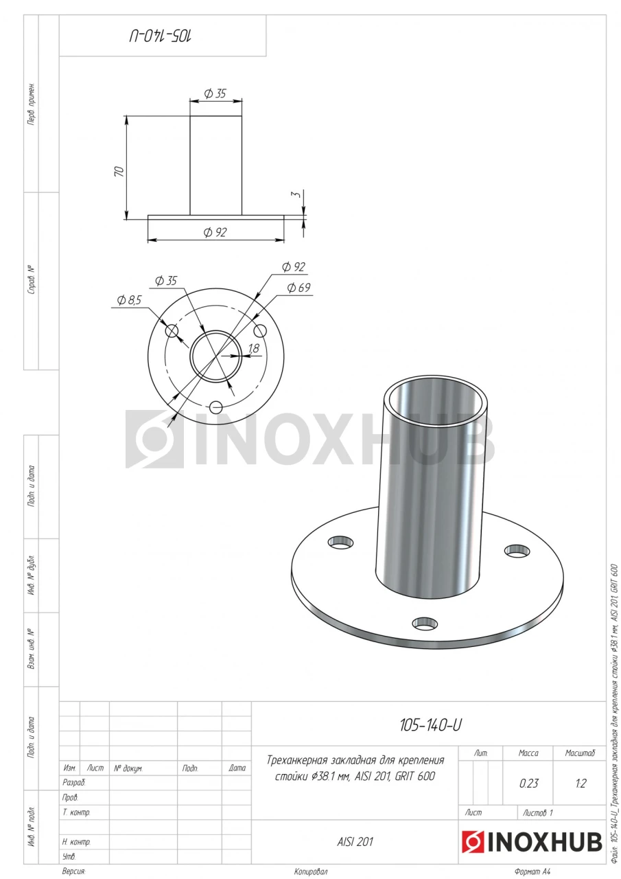Треханкерная закладная для крепления стойки Ø38.1 мм, AISI 201, GRIT 600