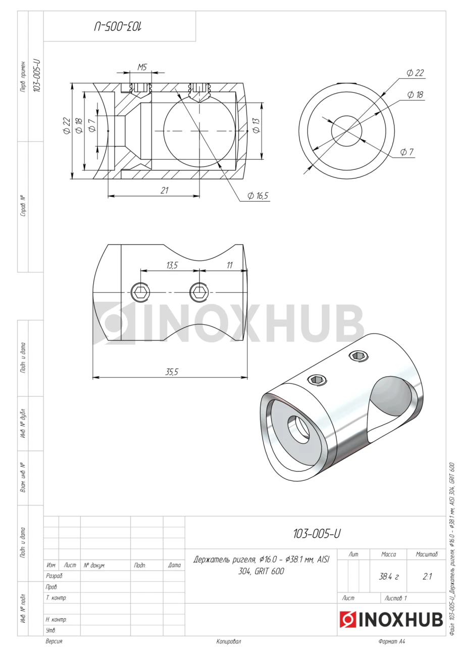 Держатель ригеля, Ø16.0 - Ø38.1 мм, AISI 304, GRIT 600