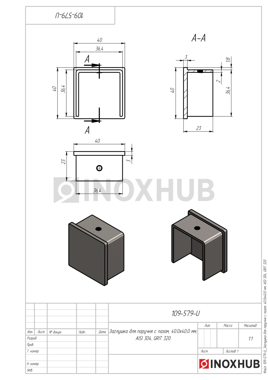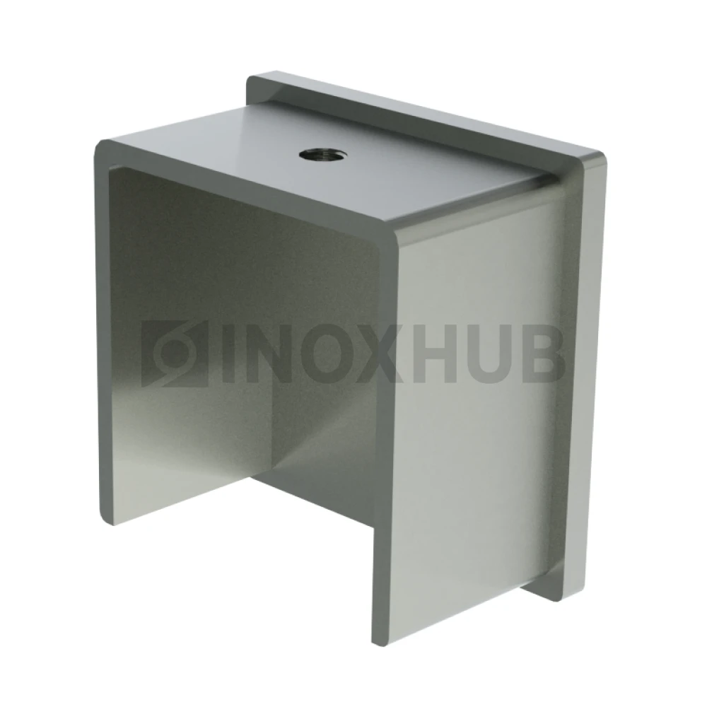 Прямоугольная заглушка для поручня 40х40 мм и пазом для стекла 24х24 мм изготовлена из нержавеющей стали AISI 304. Поверхность шлифованная — GRIT 320.