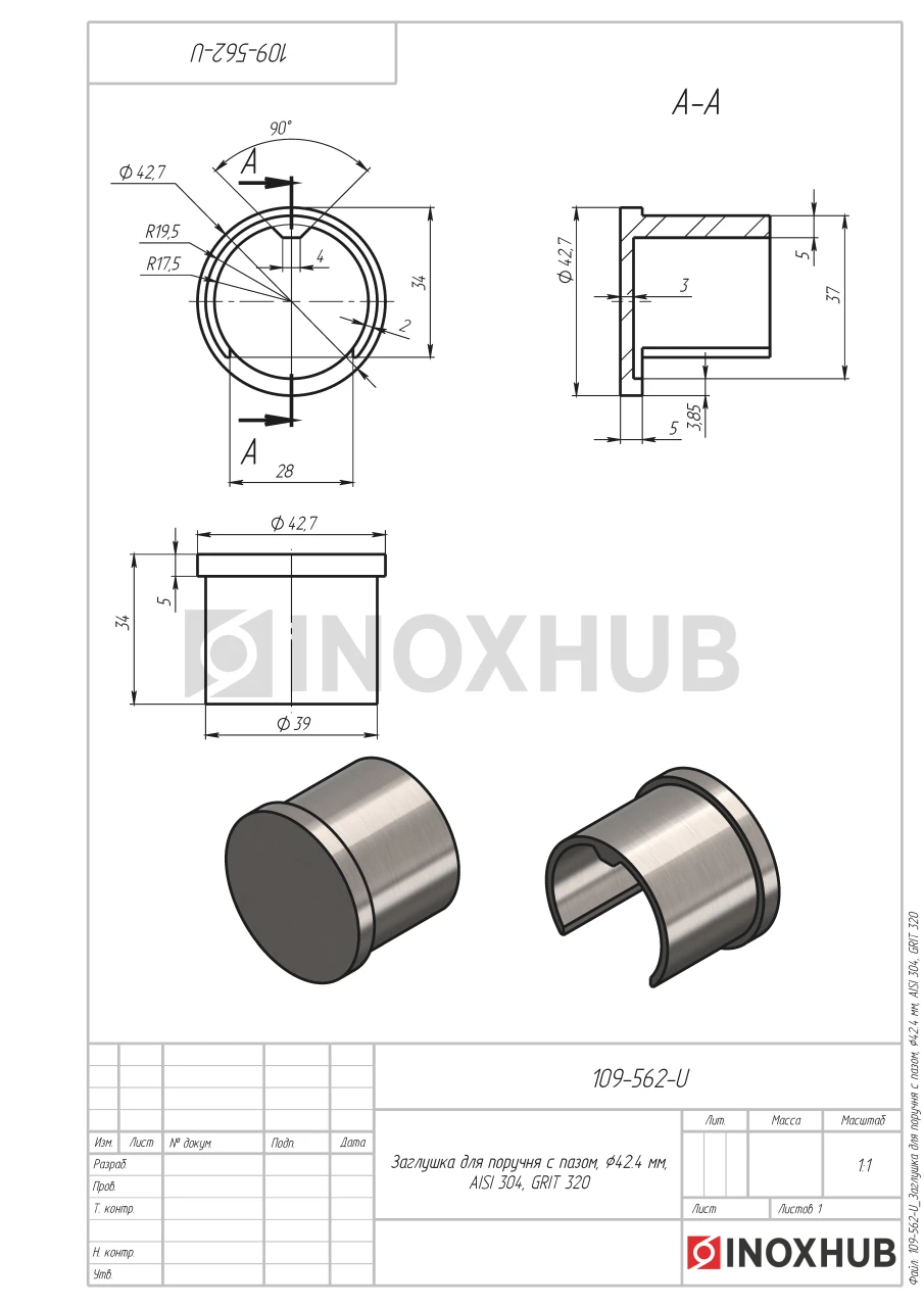 Заглушка для поручня с пазом, Ø42.4 мм, AISI 304, GRIT 320