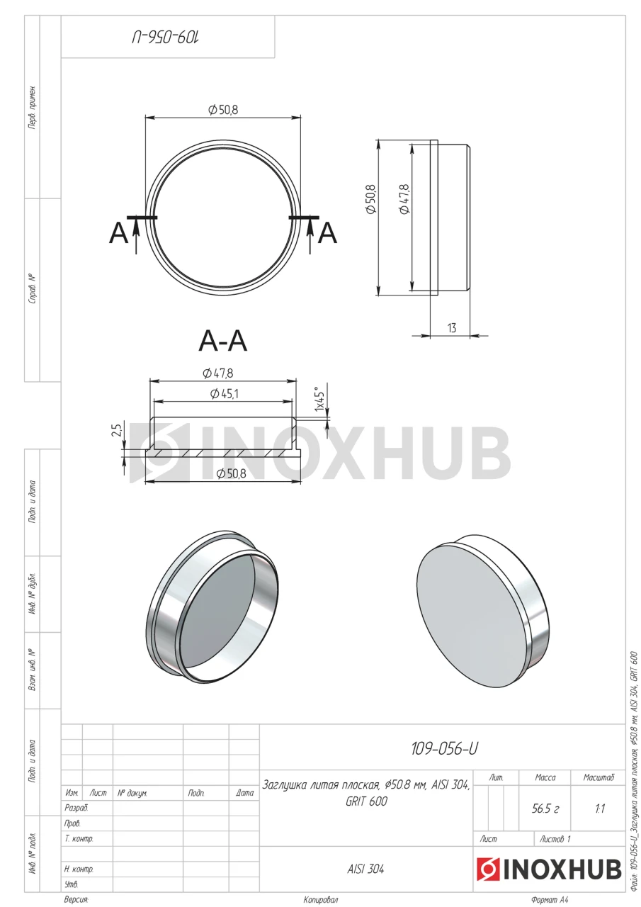 Заглушка литая плоская, Ø50.8 мм, AISI 304, GRIT 600