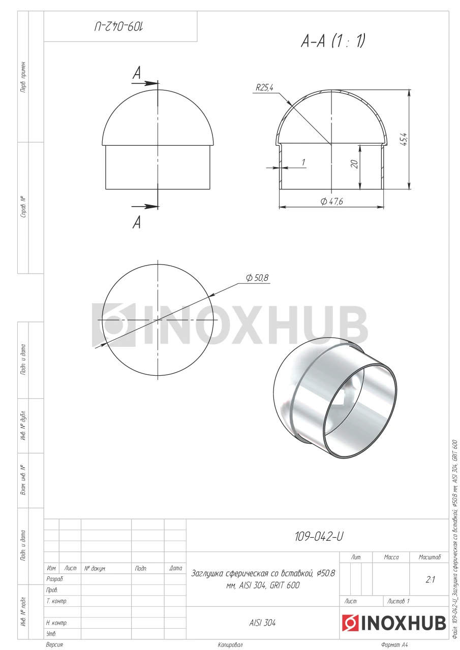 Заглушка сферическая со вставкой, Ø50.8 мм, AISI 304, GRIT 600