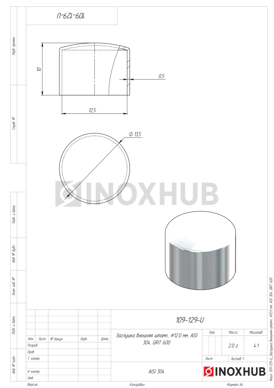 Штампованная заглушка внешняя изготовлена из стали марки AISI 304. Деталь с полированной поверхностью GRIT 600 подходит для труб диаметром 12 мм.