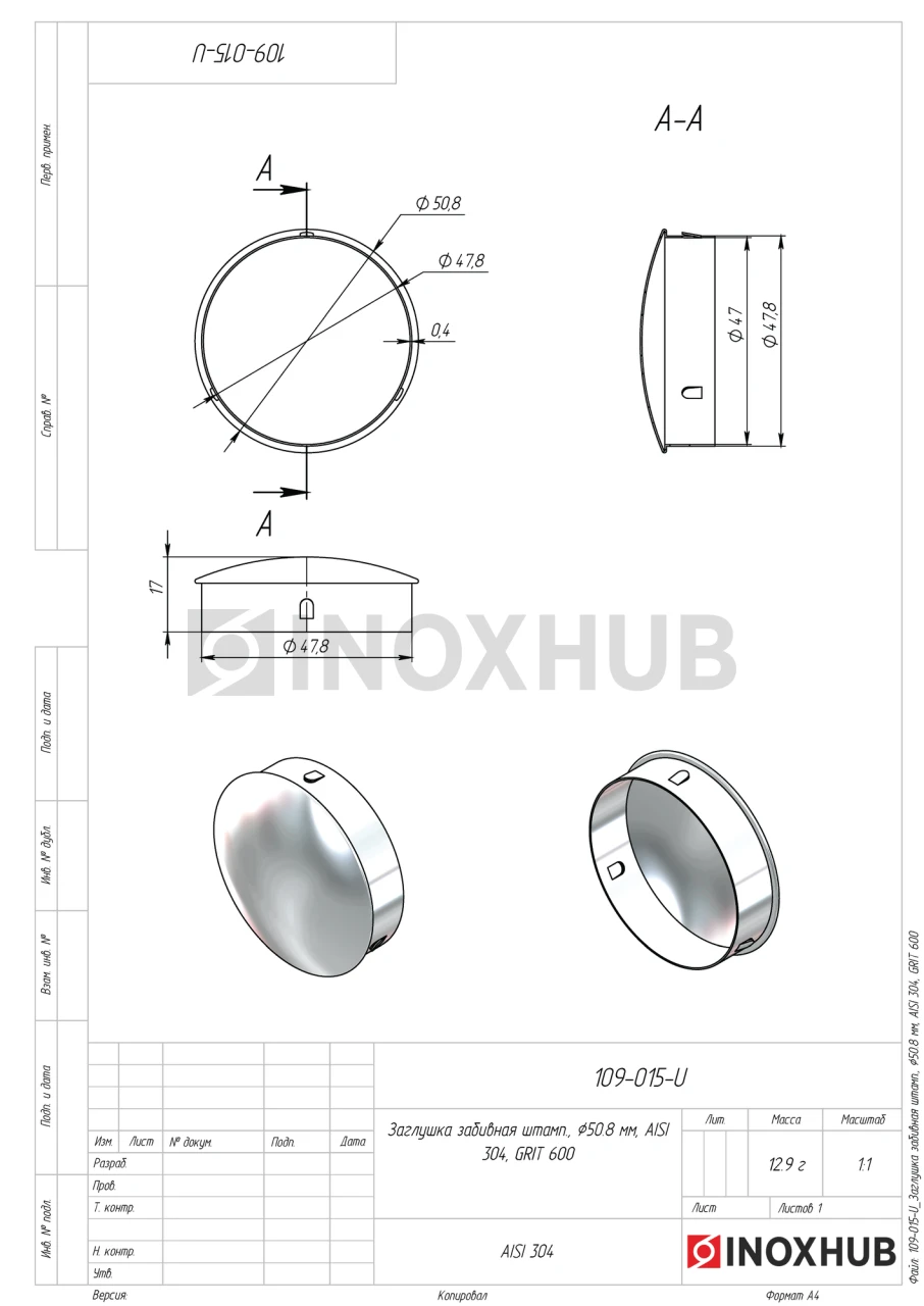 Заглушка забивная штамп., Ø50.8 мм, AISI 304, GRIT 600