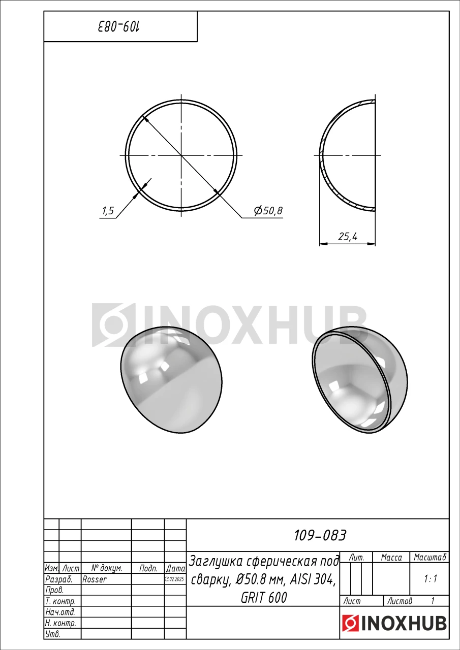 Заглушка сферическая под сварку, Ø50.8 мм, AISI 304, GRIT 600