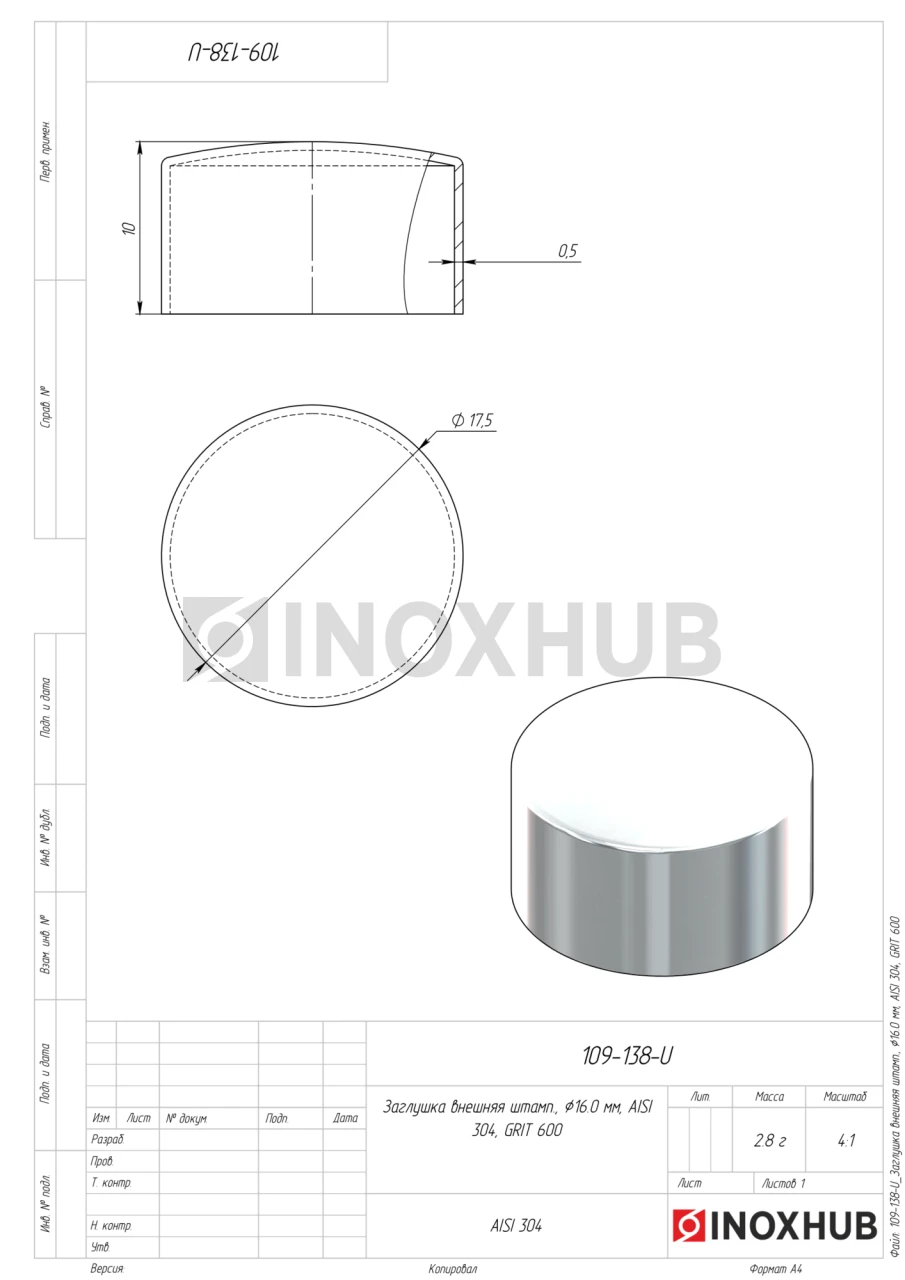 Заглушка внешняя штамп., Ø16.0 мм, AISI 304, GRIT 600