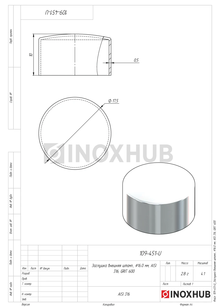 Заглушка внешняя штамп., Ø16.0 мм, AISI 316, GRIT 600 в продаже и под заказ. Оперативная доставка со склада в Москве. Все товары соответствуют стандартам качества.