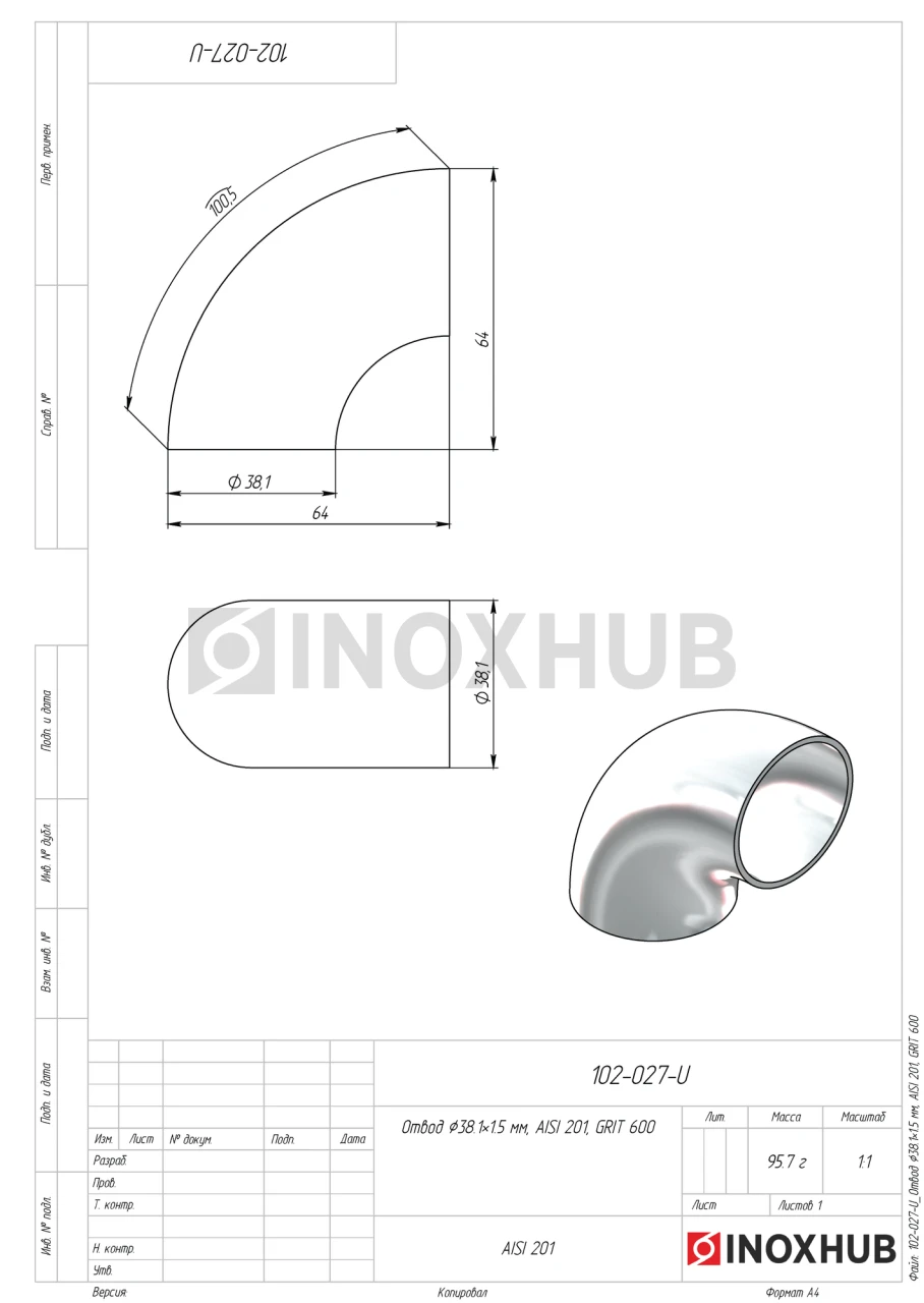 Отвод Ø38.1×1.5 мм, AISI 201, GRIT 600