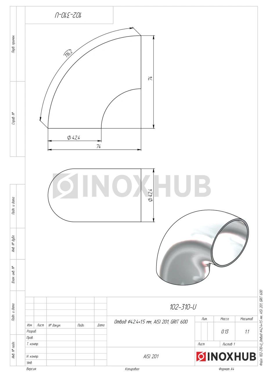 Отвод Ø42.4×1.5 мм, AISI 201, GRIT 600