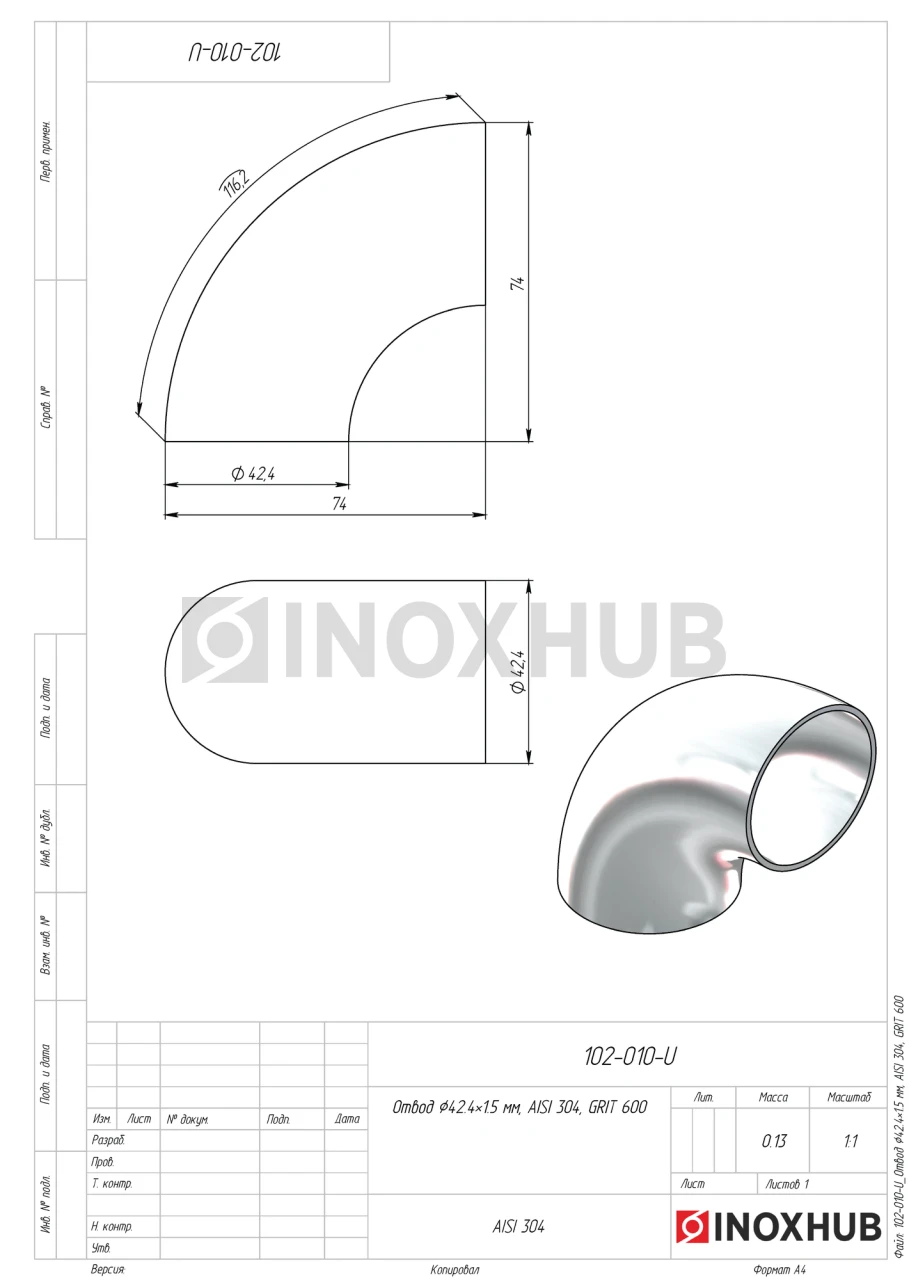 Отвод Ø42.4×1.5 мм, AISI 304, GRIT 600