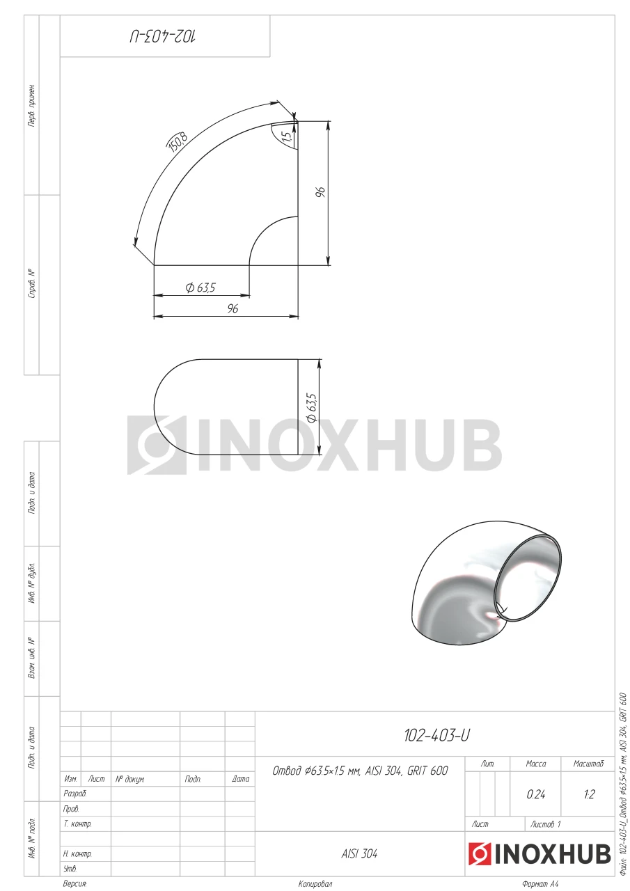 Отвод Ø63.5×1.5 мм, AISI 304, GRIT 600