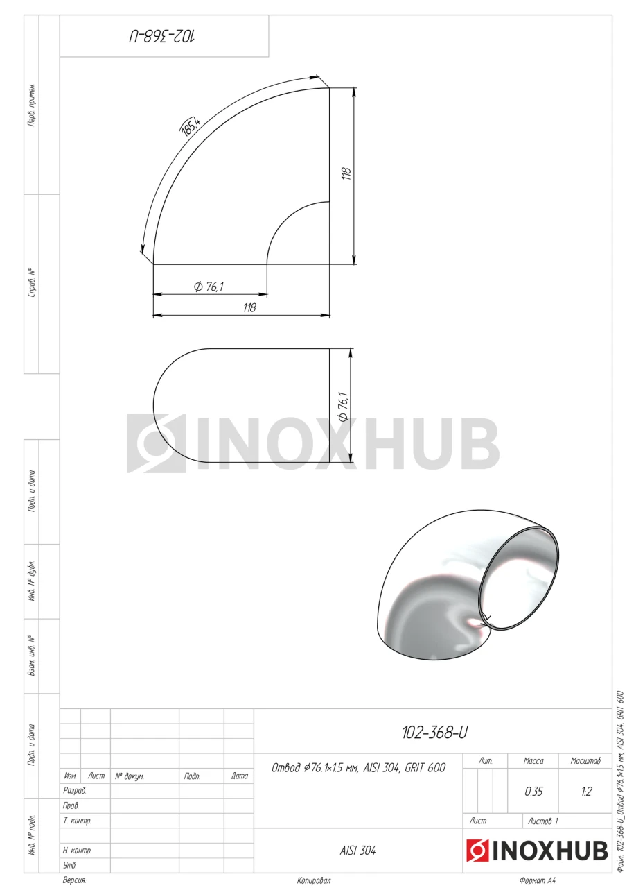 Отвод Ø76.1×1.5 мм, AISI 304, GRIT 600