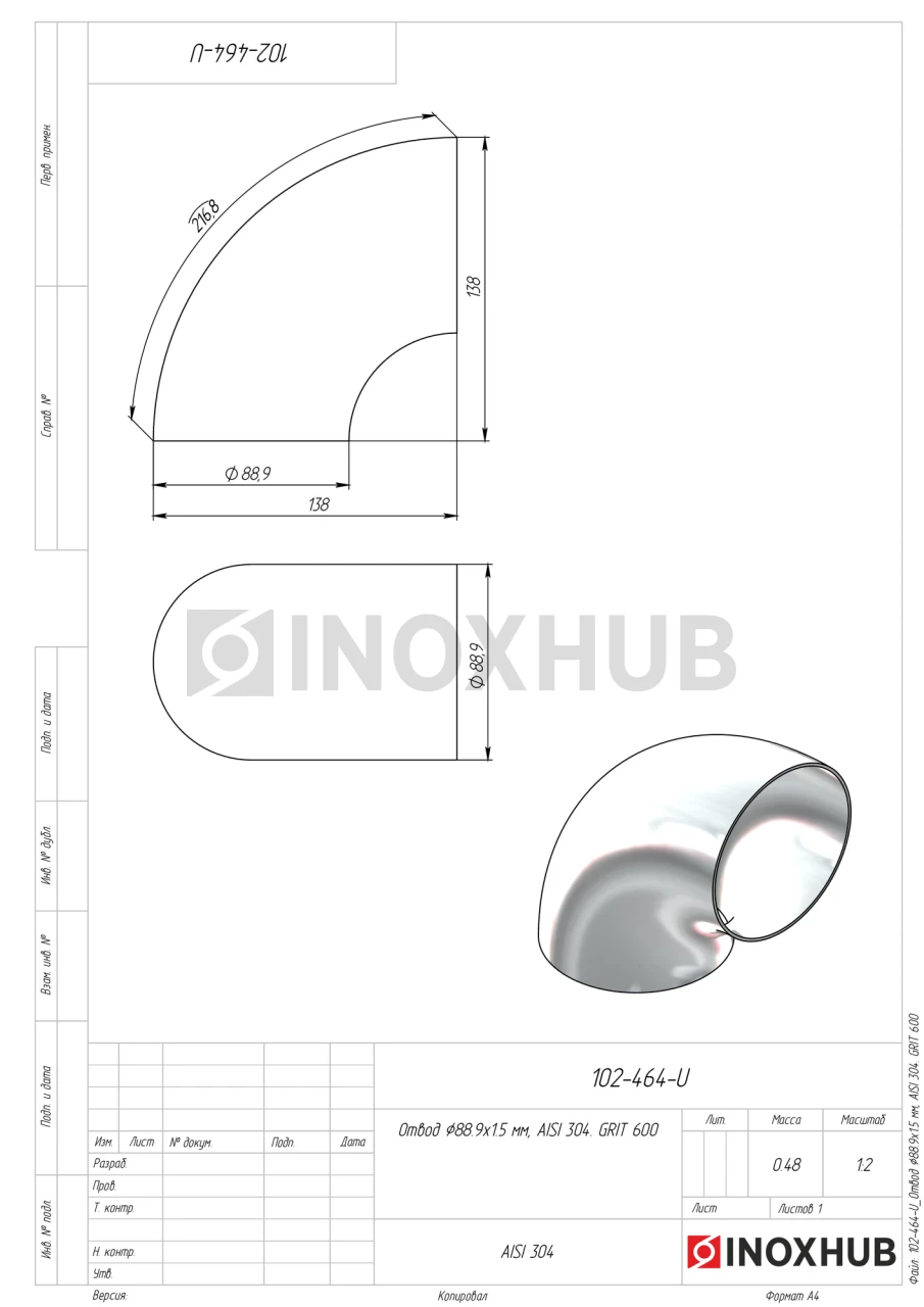 Отвод для поручня изготовлен из стали AISI 304. Глянцевый отвод имеет поверхность GRIT 600, подходит для труб диаметром 88,9 мм и толщиной стенки 1,5 мм. Длина дуги — 216,8 мм.