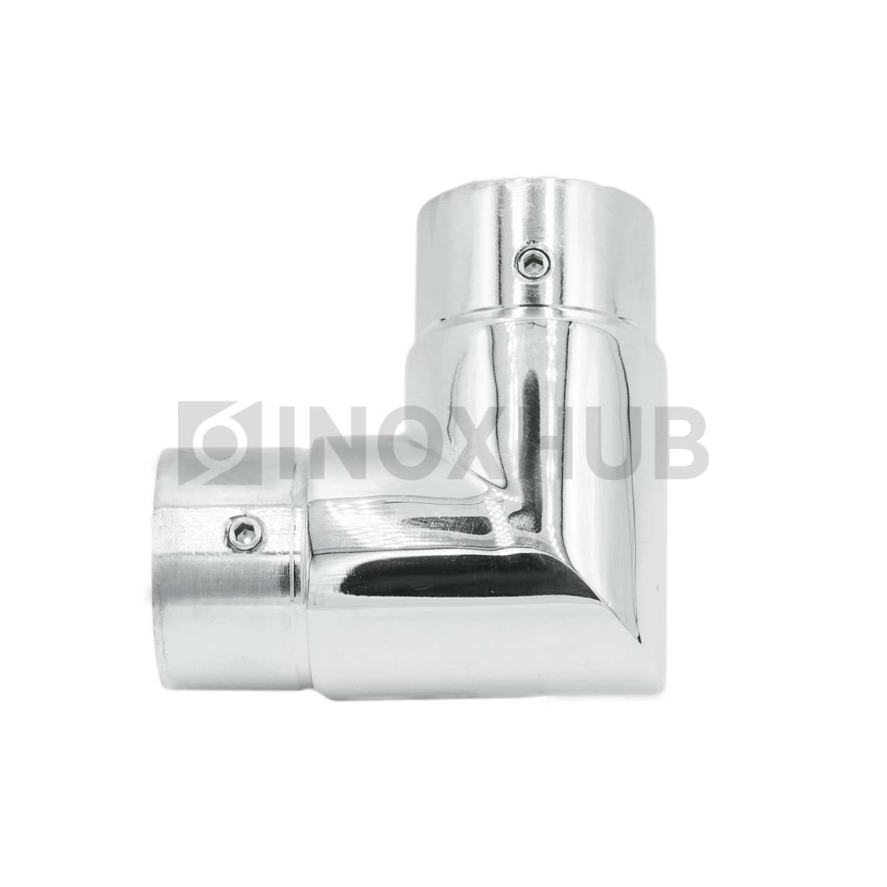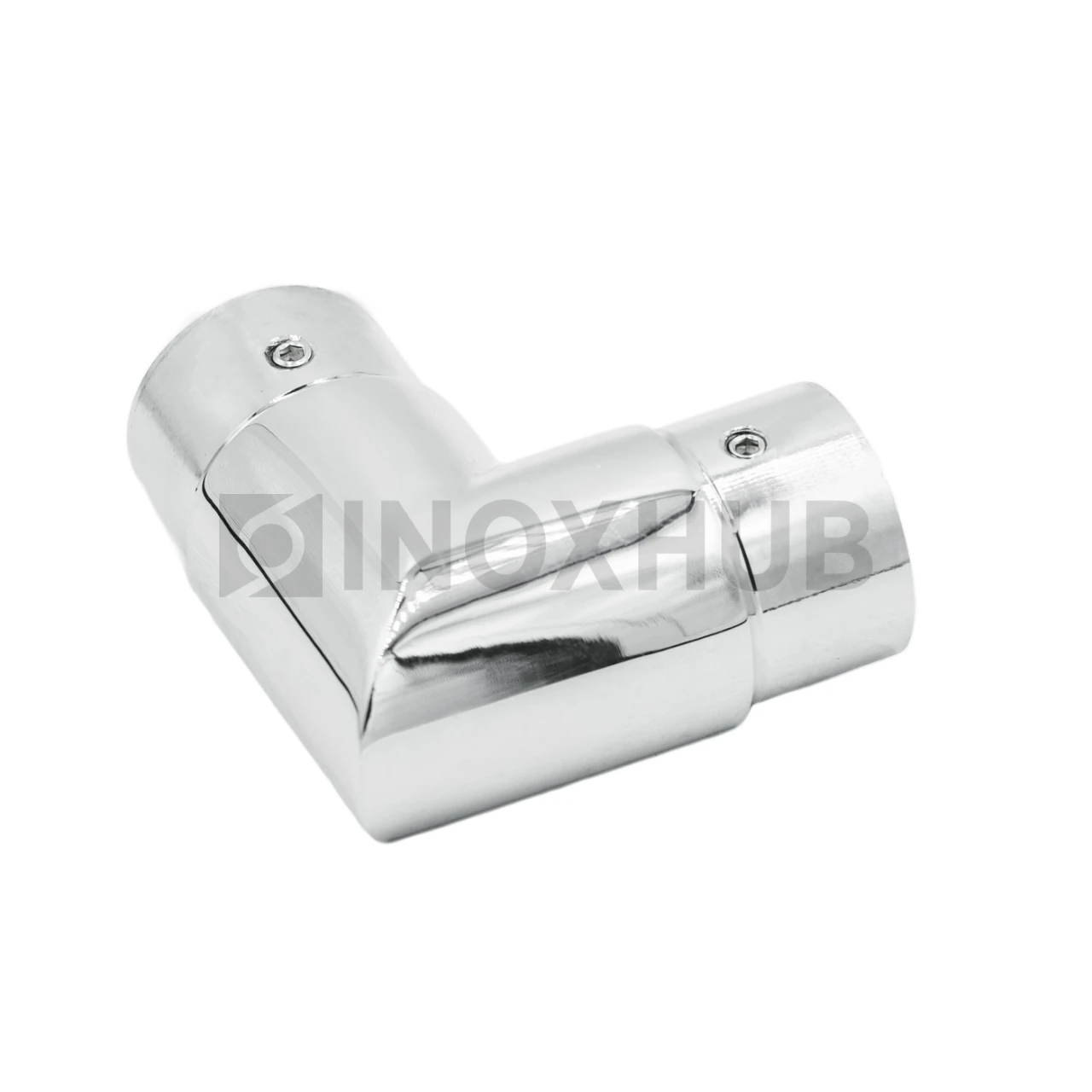 Отвод для поручня с пазом. Выполнен из высокопрочной стали AISI 304. Это позволяет устанавливать его на улице. Поверхность блестящая, полированная.
