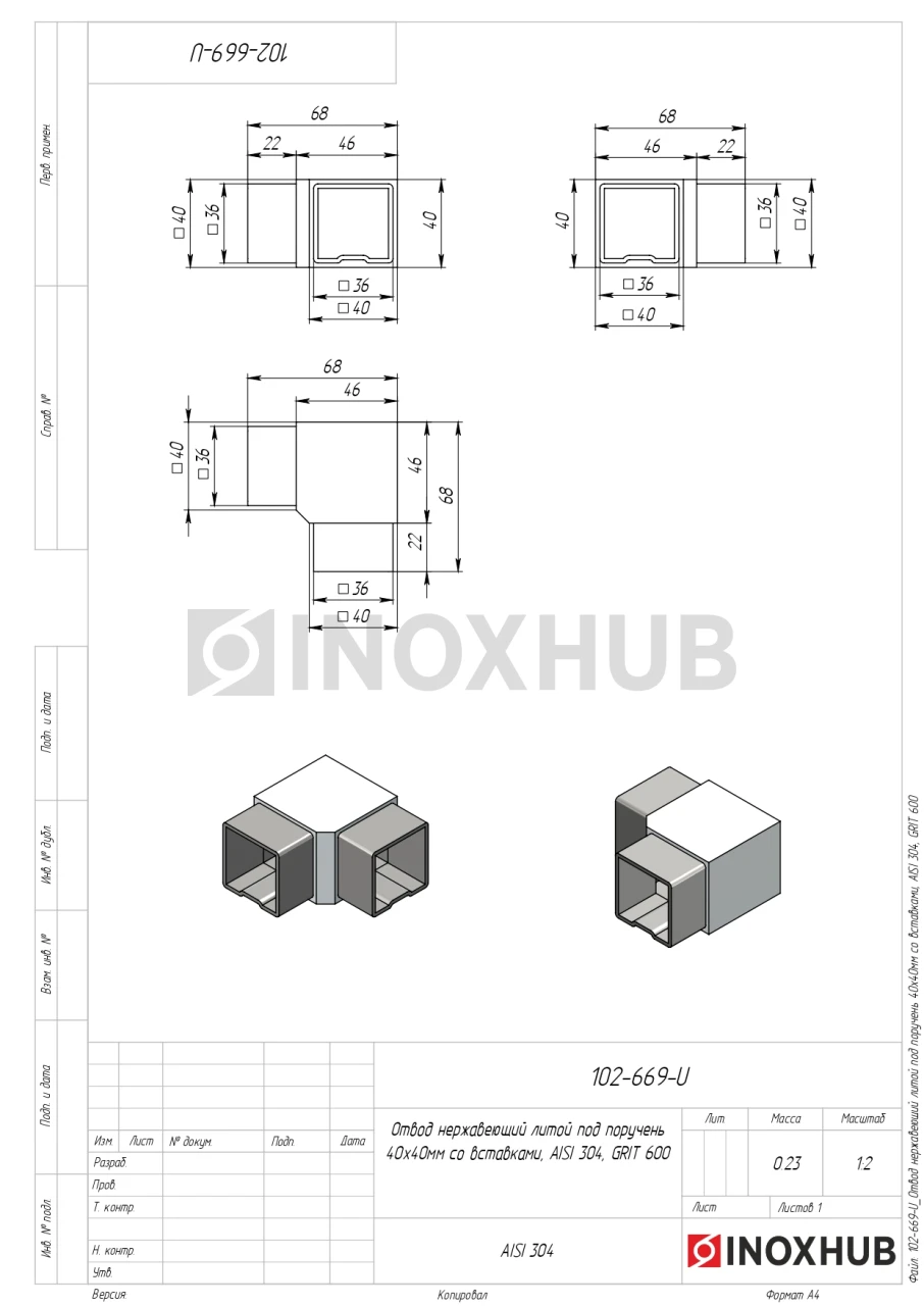 Литой отвод из стали AISI 304 имеет повышенную прочность по сравнению со штампованными аналогами. Элемент подходит для эксплуатации на улице и в помещении. Используется для квадратных поручней 40х40 мм. Поверхность GRIT 600 — полированная.