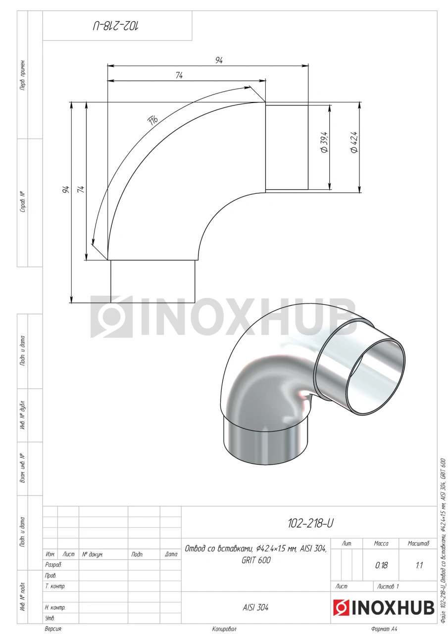 Отвод со вставками, Ø42.4×1.5 мм, AISI 304, GRIT 600
