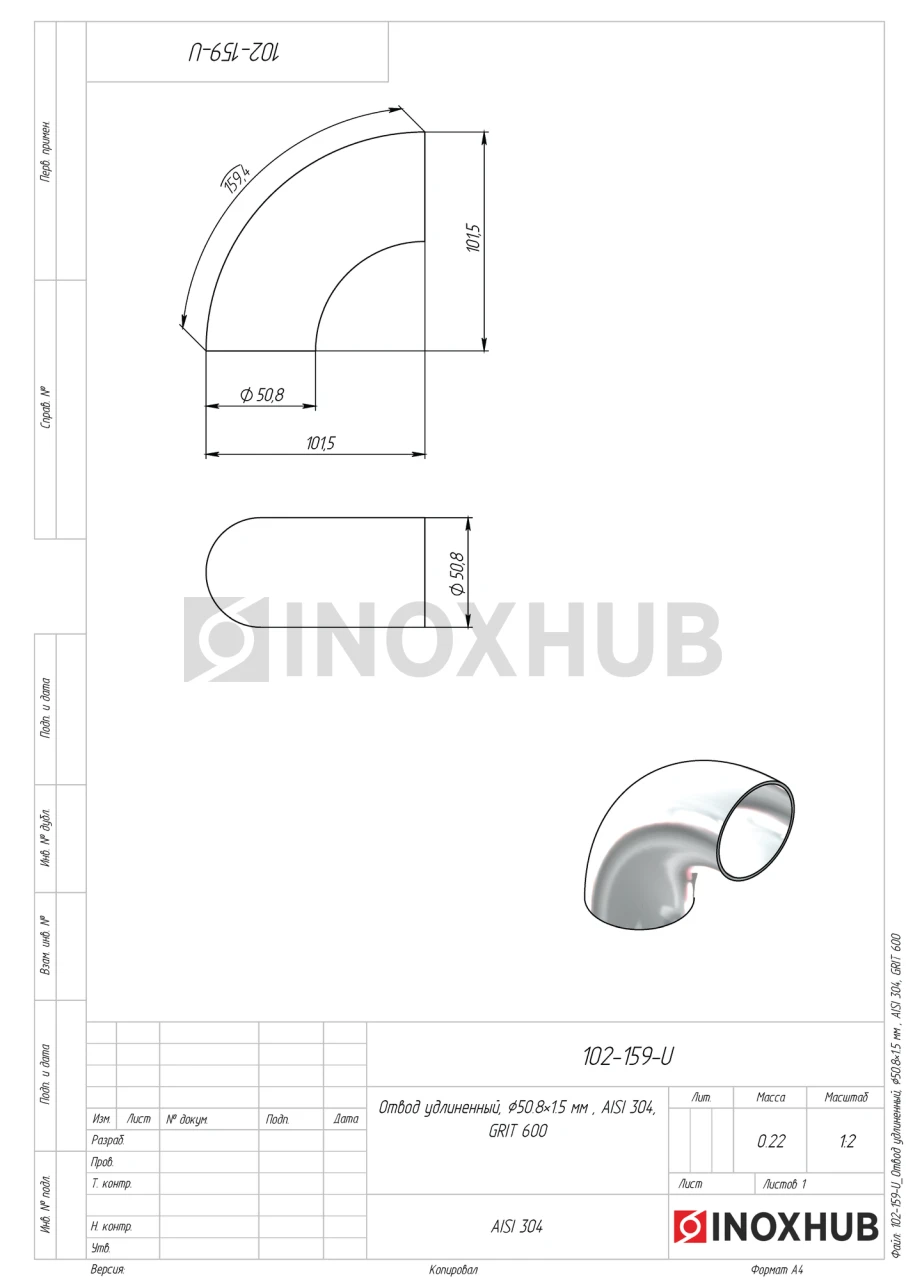 Отвод удлиненный, Ø50.8×1.5 мм, AISI 304, GRIT 600