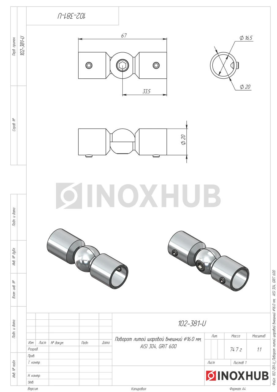 Поворот литой шаровой внешний Ø16.0 мм, AISI 304, GRIT 600