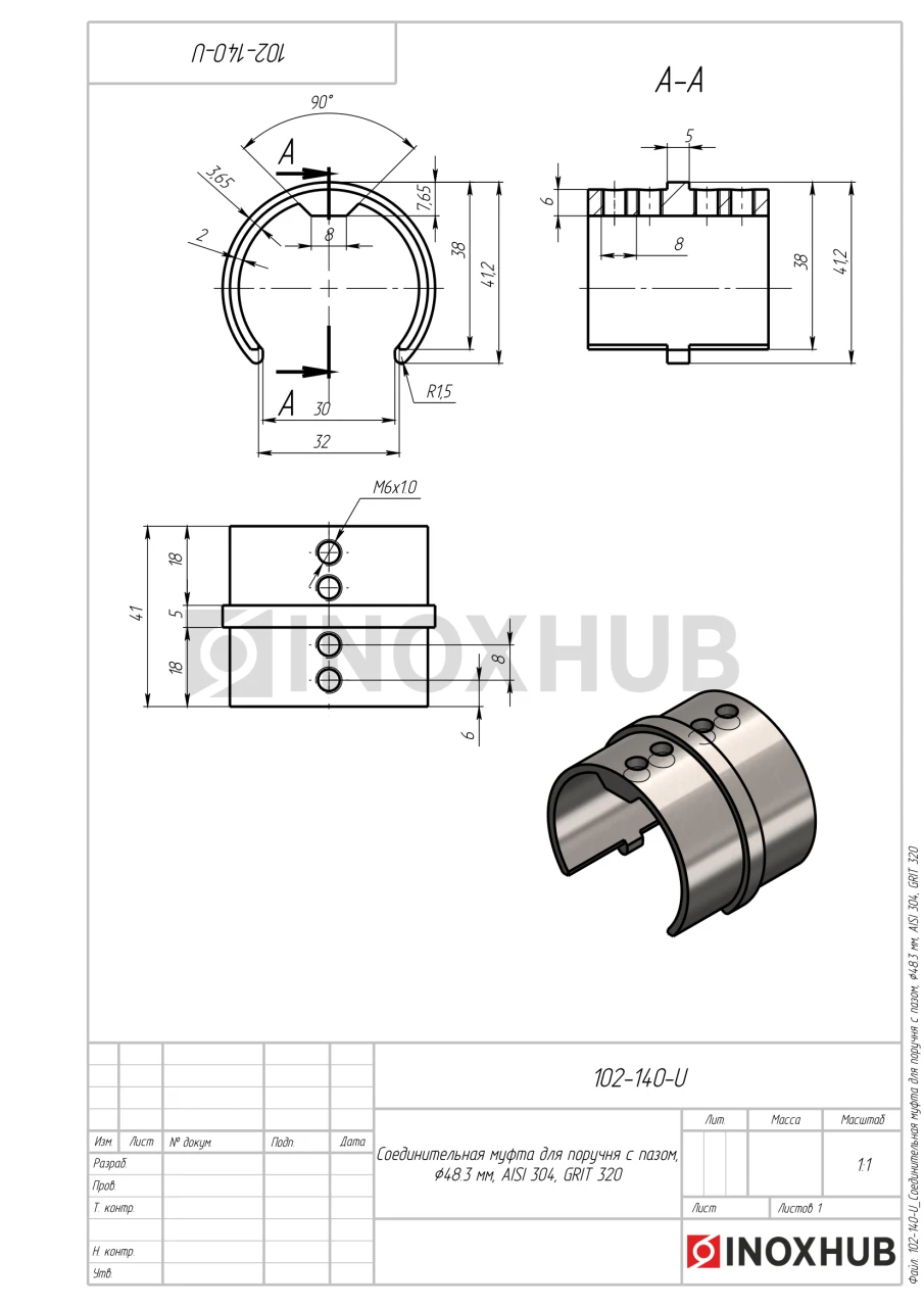Муфта для соединения труб с пазом. Выполнена из высокопрочной стали AISI 304. Поверхность изделия GRIT 320 — шлифованная.