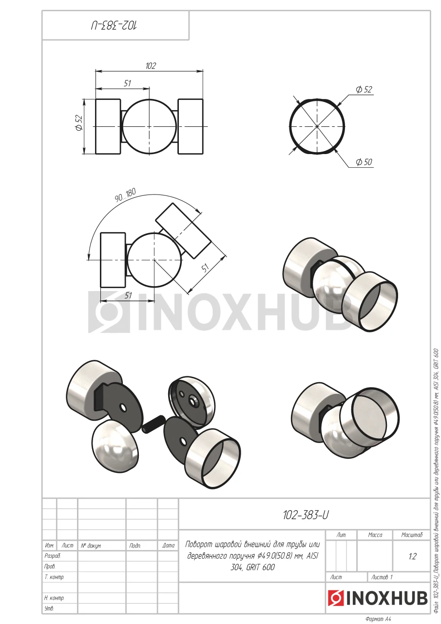 Поворот шаровой внешний для трубы или деревянного поручня, Ø50.8 мм, AISI 304, GRIT 600