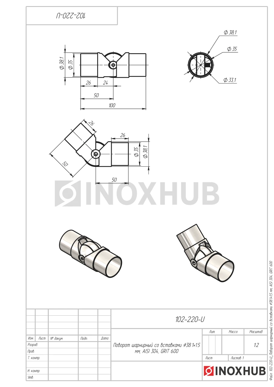 Поворот шарнирный со вставками, Ø38.1×1.5 мм, AISI 304, GRIT 600