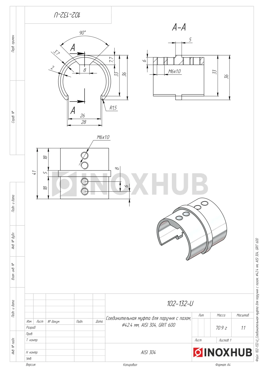 Соединительная муфта для поручня с пазом. Выполнена из стали AISI 304. Поверхность полированная — GRIT 600.