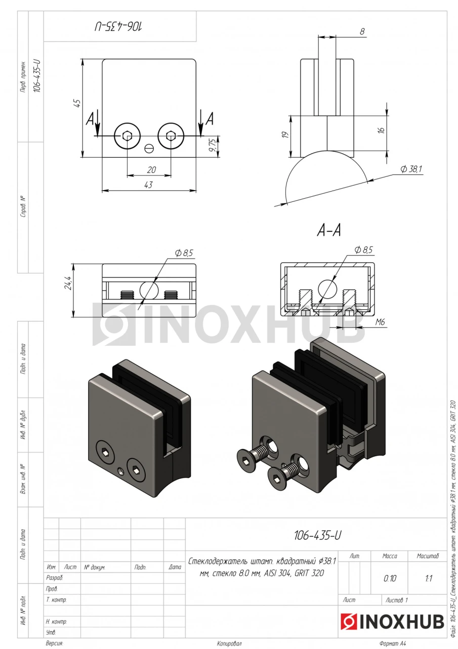Штампованный квадратный стеклодержатель под круглую стойку диаметром 38,1 мм и стекло толщиной 8 мм. Корпус крепления шлифованный (поверхность GRIT 320). Размер изделия (ДхШхВ) — 43х24,4х45 мм. Марка стали — AISI 304, деталь можно эксплуатировать в уличных условиях.