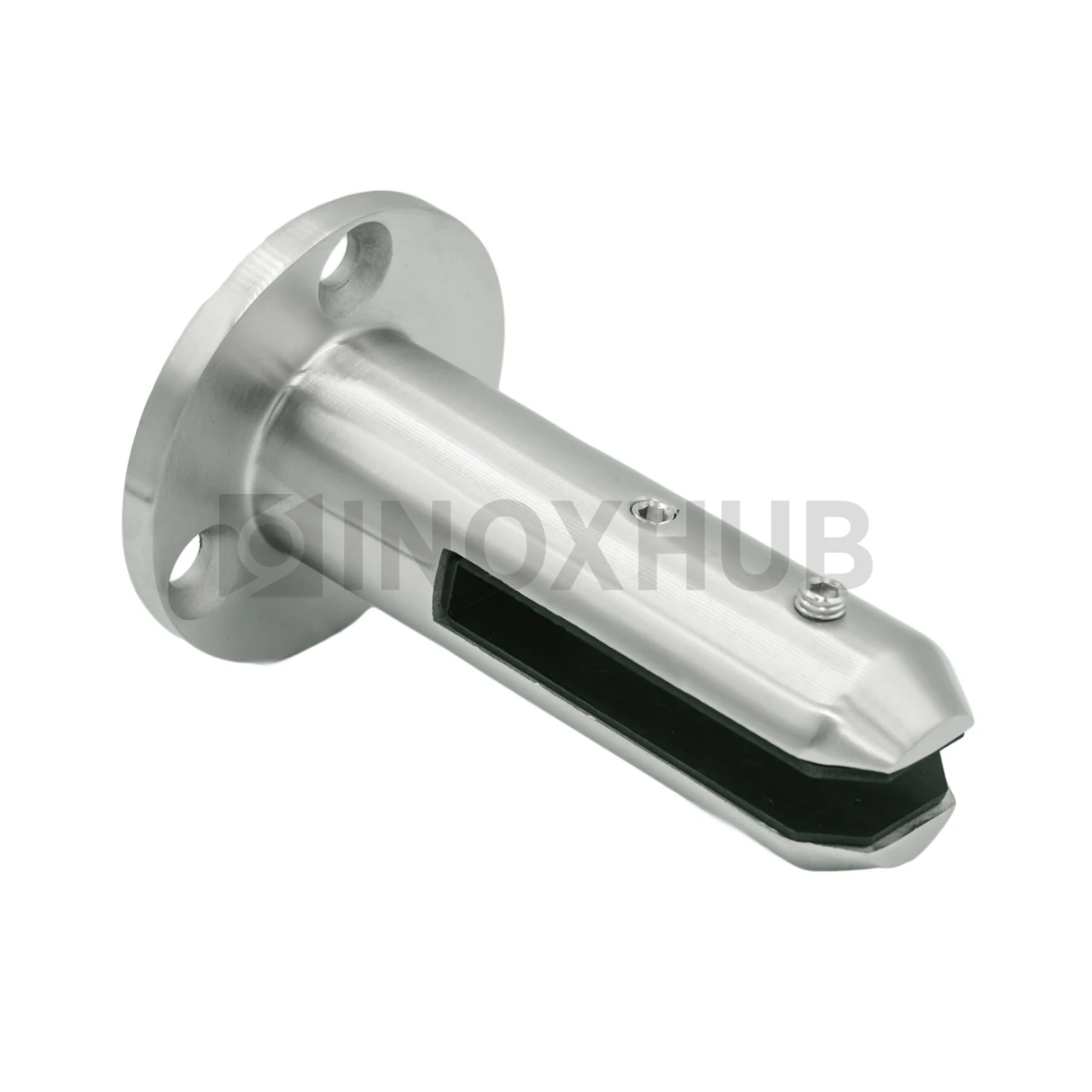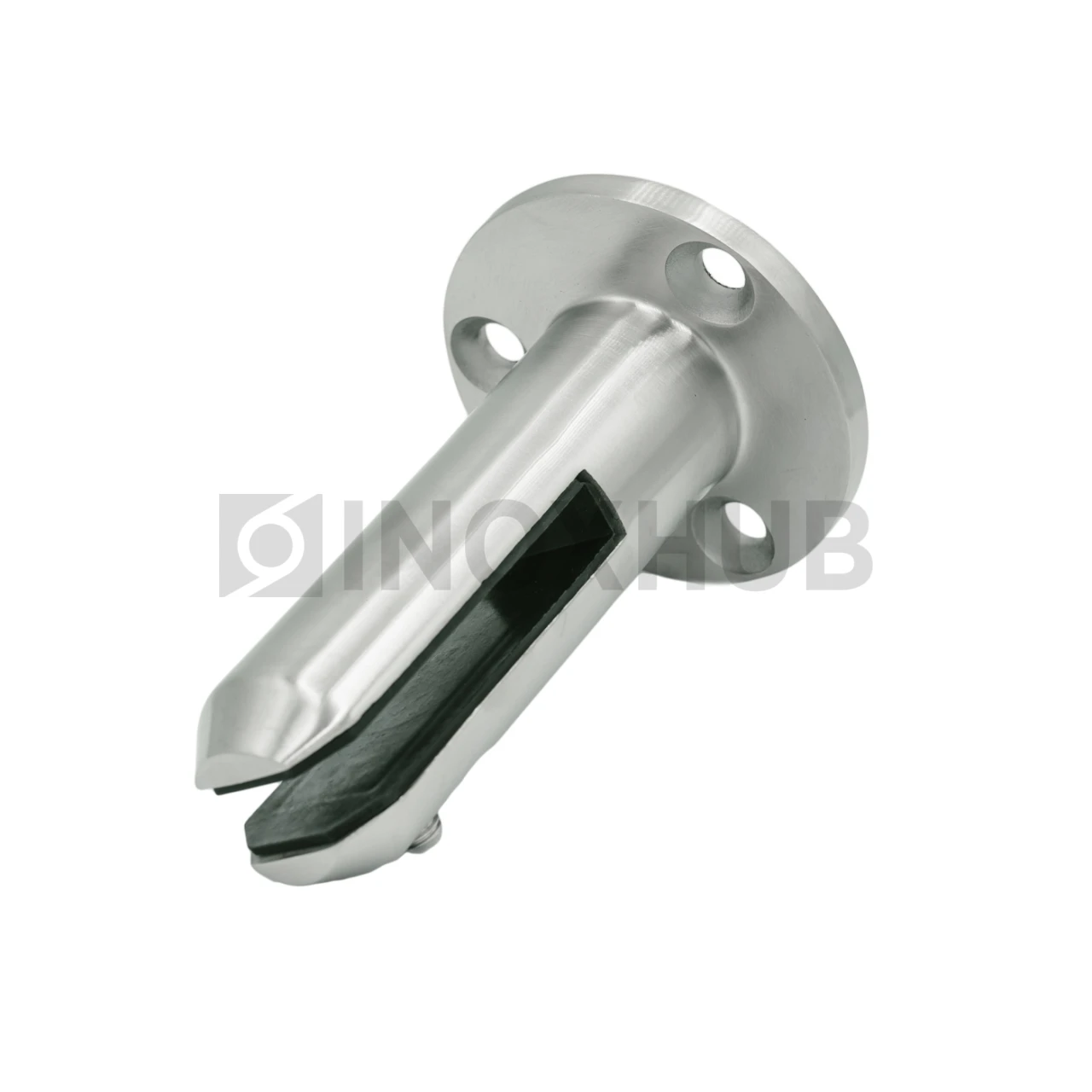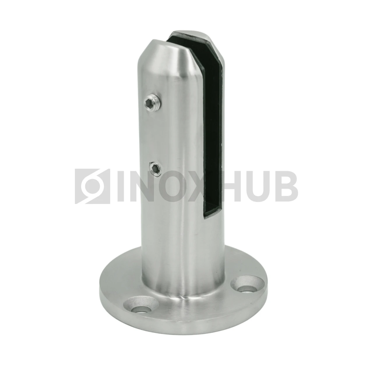 Нержавеющий стеклодержатель изготовлен методом литья из стали марки AISI 304. Крепление можно использовать как в помещениях, так и на улице. Поставляется с комплектом уплотнителей, толщину которых можно менять в зависимости от толщины стекла. Подходит для стекол 10-12 мм. Диаметр основания изделия — 100 мм, высота — 160 мм.
