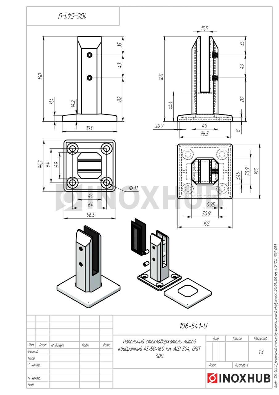 Напольный квадратный стеклодержатель для стекла литой. Выполнен из стали AISI 304 высокого качества, имеет полированную поверхность GRIT 600.