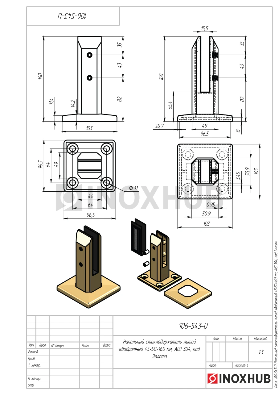Напольный стеклодержатель литой квадратный 45×50×160 мм, AISI 304, под Золото