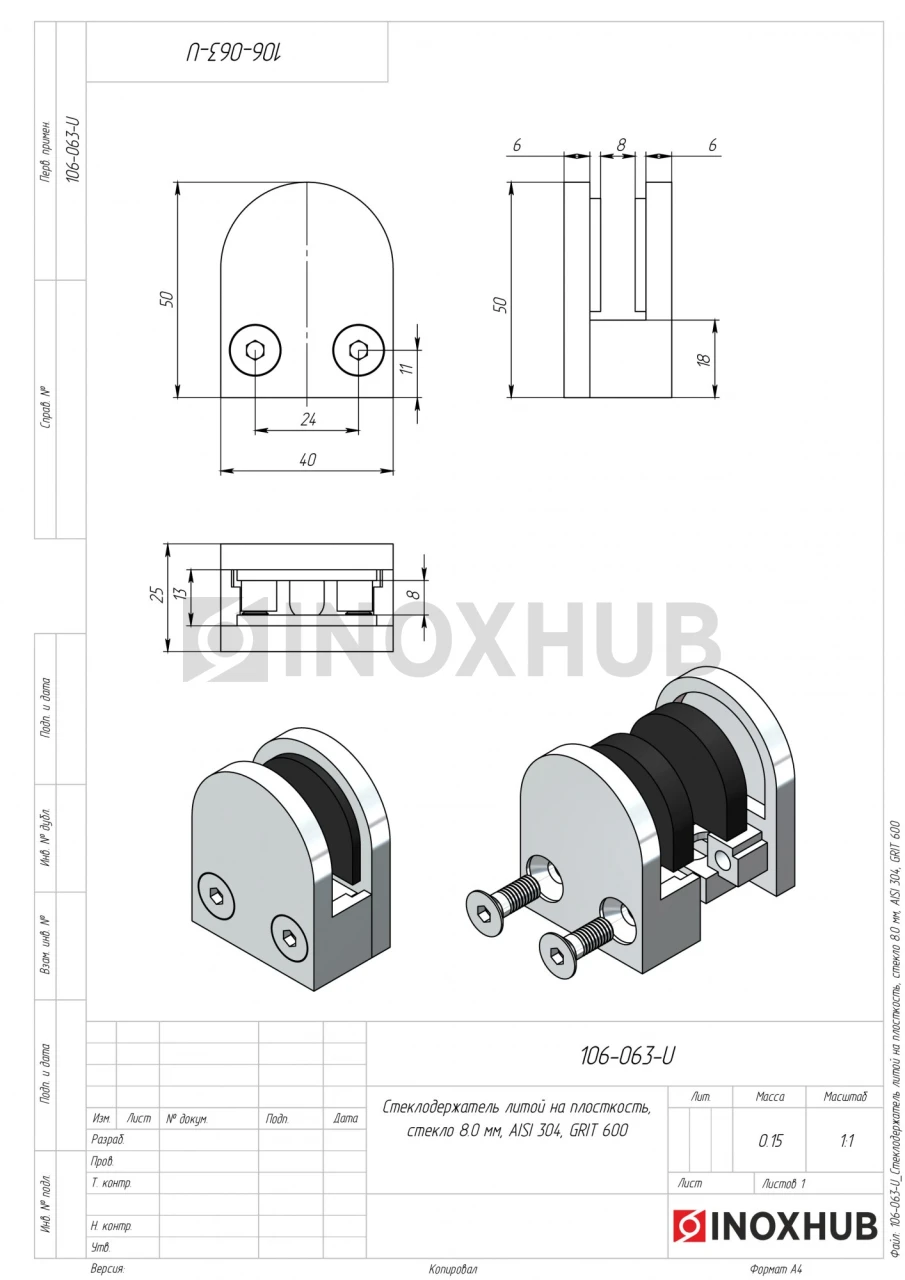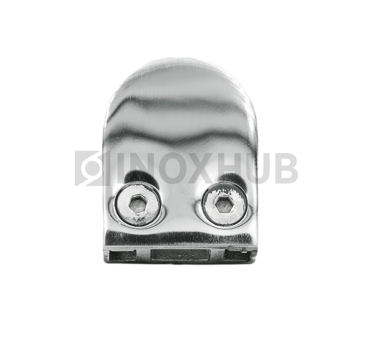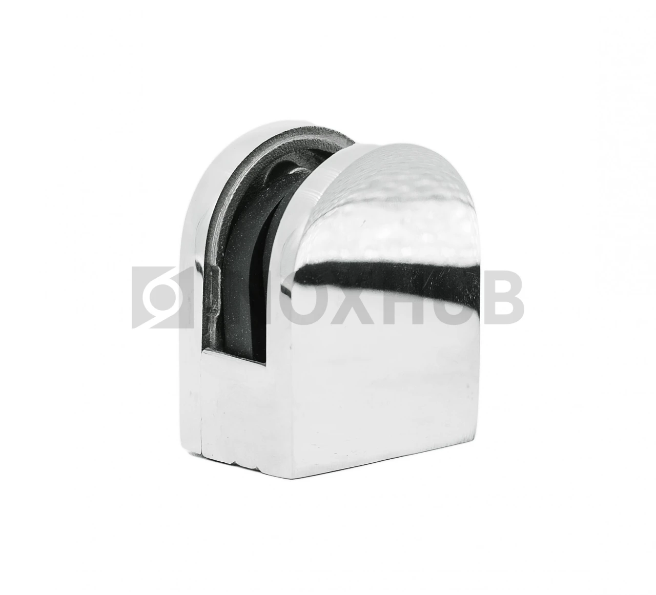 Литой стеклодержатель на плоскость выполнен из стали AISI 304. Имеет полированную поверхность GRIT 600. Форма детали полукруглая. Вид — зажимной. Изготовлен методом литья, что наделяет его высокой прочностью. Марка стали позволяет использовать стеклодержатель на улице и в помещении.