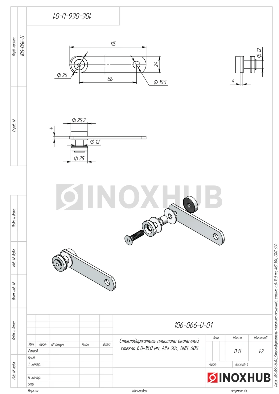 Оконечный пластинчатый стеклодержатель подходит для стекол толщиной 6-18 мм. Деталь поставляется с комплектом крепежа для стеклянной панели. Пластина изготовлена из стали марки AISI 304, поэтому подходит для установки на улице. Поверхность полированная — GRIT 600.