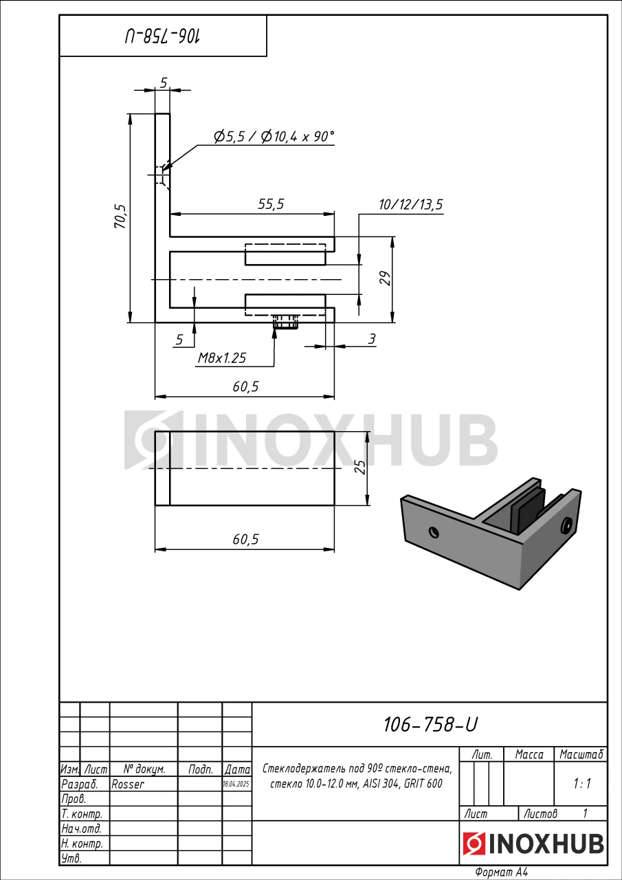 Стеклодержатель предназначен для крепления стеклянного полотна толщиной от 10 до 12 мм под углом 90 градусов к стене. Изготовлен из нержавеющей стали AISI 304, подходит для установки в помещении и на улице. Материал устойчив к коррозии, подходит для помещений с повышенной влажностью. Поверхность GRIT 600 — глянцевая, полированная.